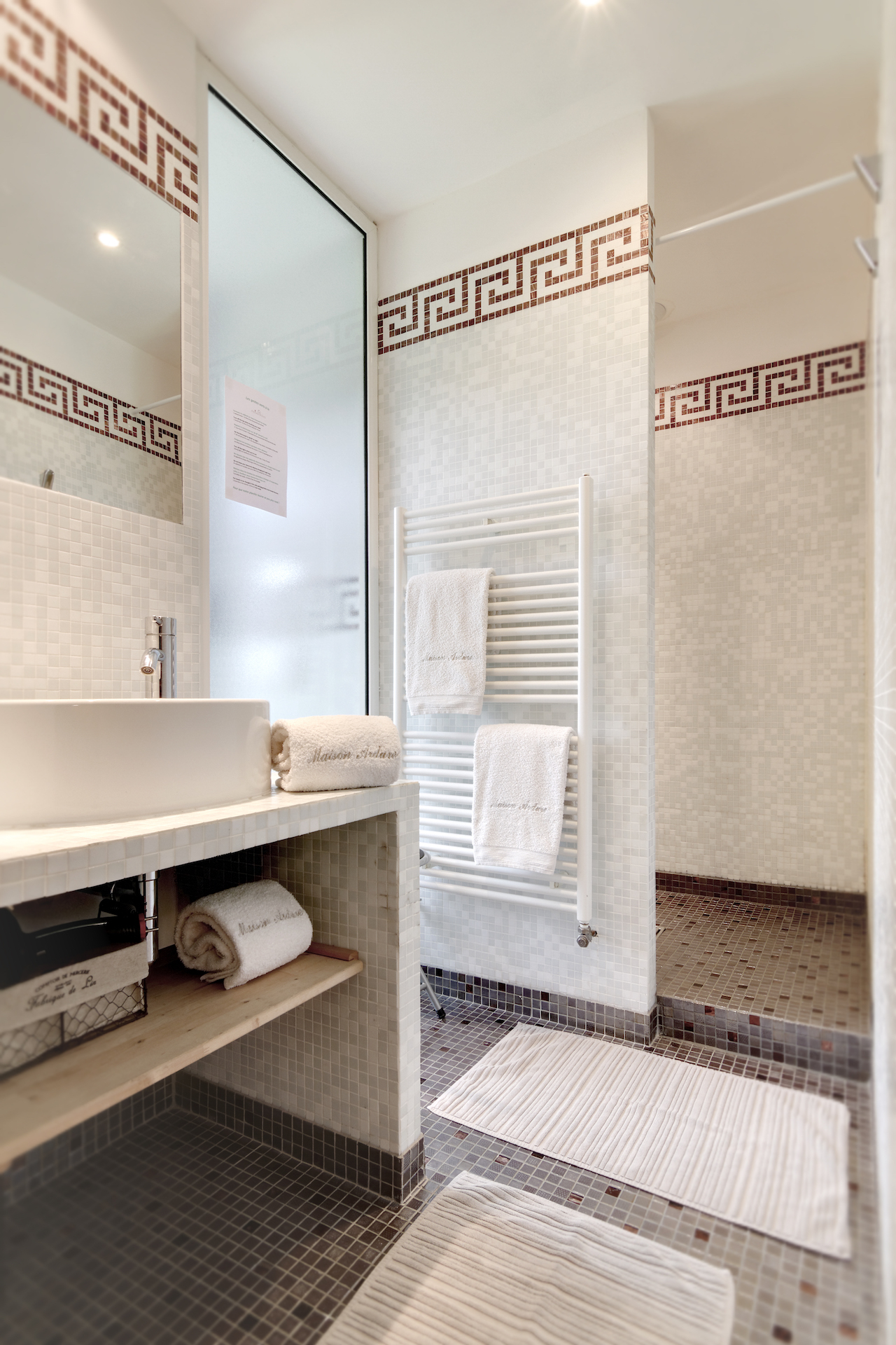 La salle de douche est équipée d’une vasque et d’une douche à l’italienne en mosaïque.
